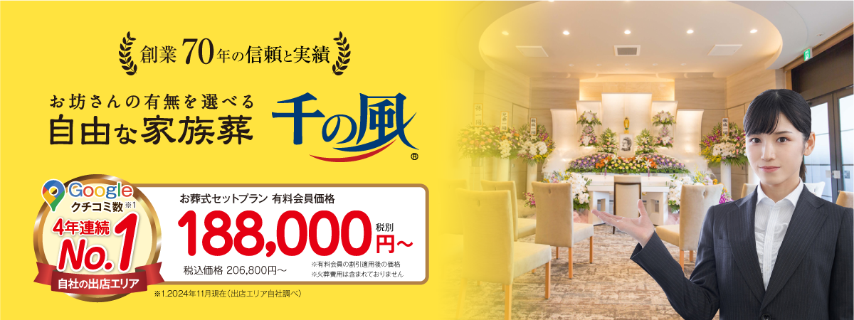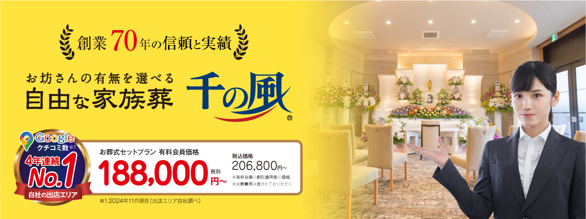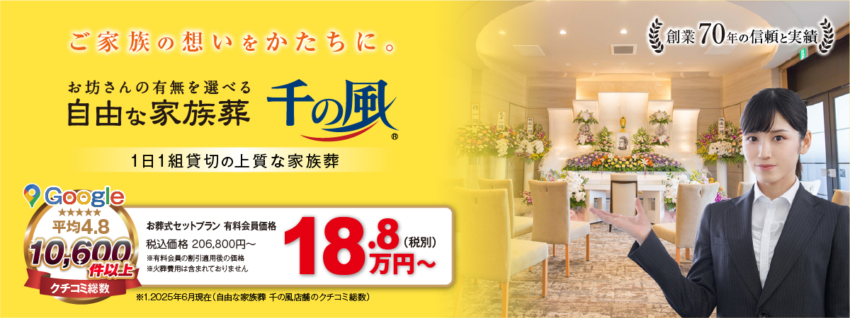 自由な家族葬 千の風は昭和初期から綿々と紡いできた70年を超える実績と信頼があります。地域貢献活動や終活セミナーなどのイベントも随時開催しております。自由な家族葬 千の風は、これからも地域の皆様に信頼されるお葬式を提供してまいります。