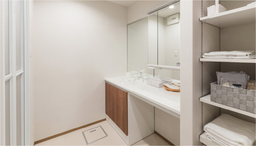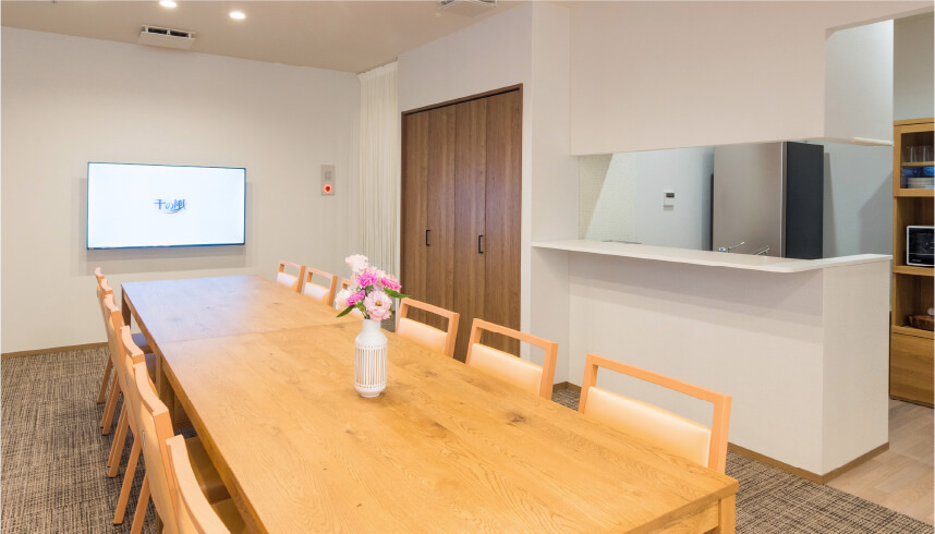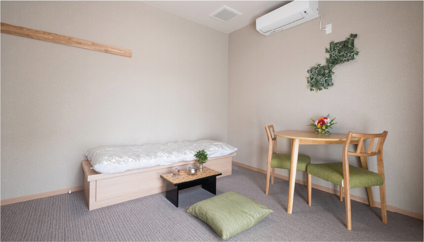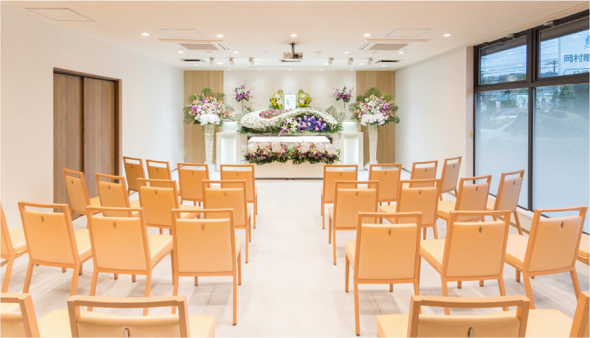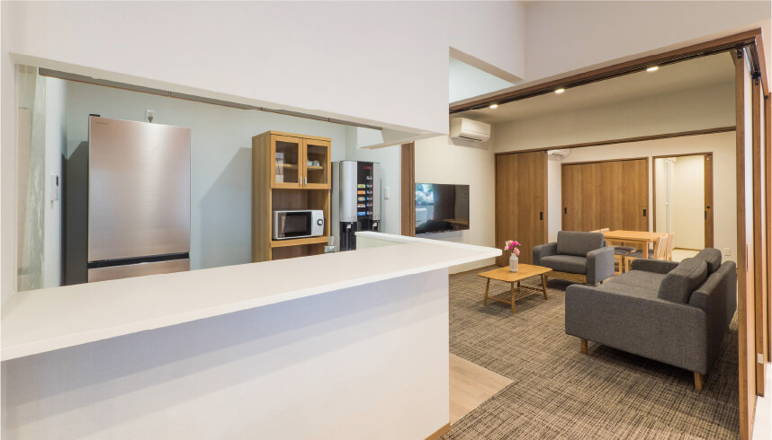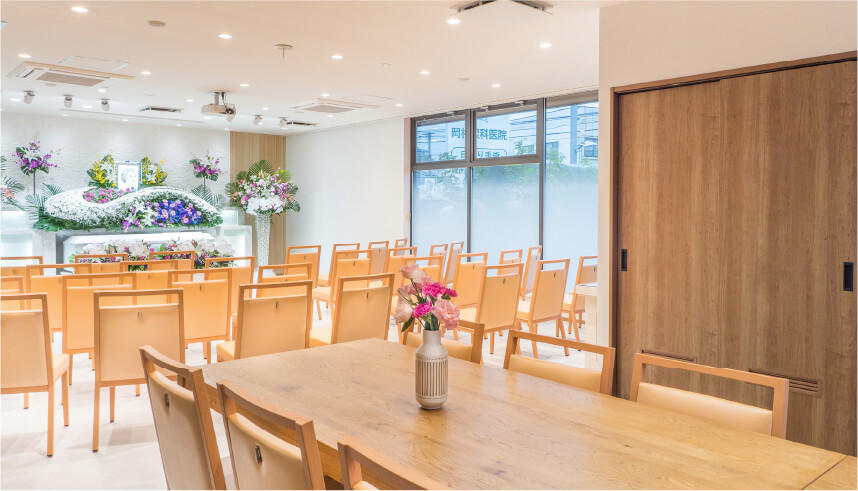 ホールとオープンリビングのほか、ご遺族控室を1部屋、安置室を1部屋備えております。バスルームや各種アメニティーを完備しており、宿泊も可能です。故人様との最後の時間を心ゆくまでごゆっくりお過ごしいただけます。また、バリアフリー対応のため、ご高齢の方や身体の不自由な方も安心してご利用いただけます。