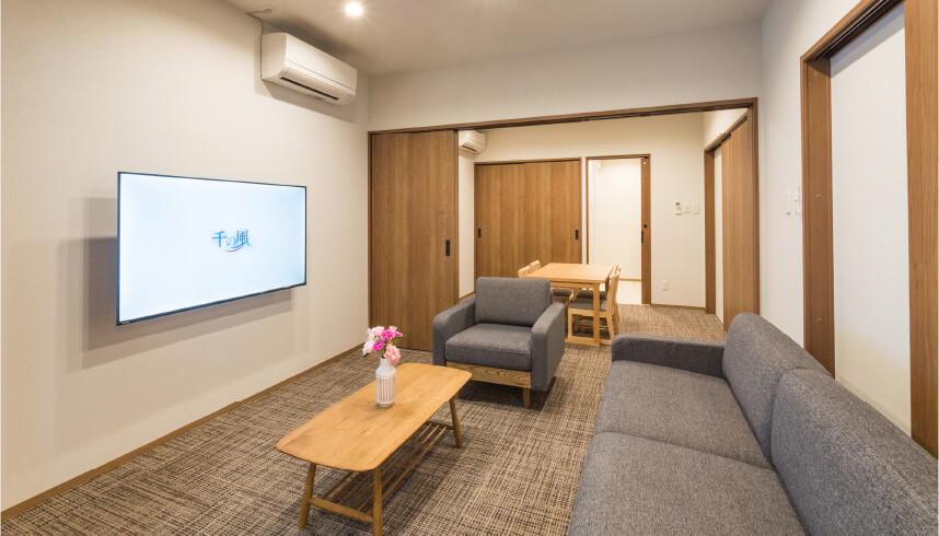 常備品 | テレビ、冷蔵庫、電子レンジ、電気ポット、寝具一式(常備2組・追加可能)、アメニティーセット、無料ドリンクサーバー、車椅子(1台) |