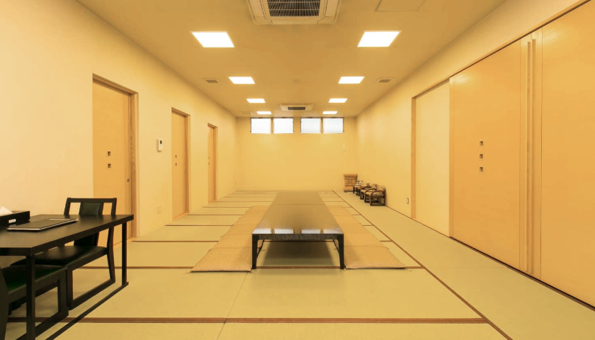 久留米市小頭町にある「家族葬 千の風 小頭式場」は、まるでご家族が集まるご自宅のリビングのような貸切ホールです。1日1組貸切のため、他のご喪家を気にすることなくご利用いただけます。ホールの収容人数は最大60名で、家族葬から一般葬儀までさまざまなスタイルに対応できるよう設計されています。室内は明るい雰囲気となるよう工夫が凝らされており、故人様を偲びつつもお別れが暗くなりすぎないように配慮されています。控室は和室25畳・和室6畳の2部屋があり、お風呂とキッチンもついています。寝具一式があり宿泊も可能です。館内はバリアフリーで車いすが1台完備されております。市内中心部にあるため宿泊施設も多く、遠路からの参列にも便利な式場です。桜を楽しめるスポットとして有名な小頭町公園も近くにあります。久留米市内では他に「家族葬 千の風 花畑式場」「家族葬 千の風 国分式場」を運営しており、ご依頼内容に応じてご紹介も可能です。