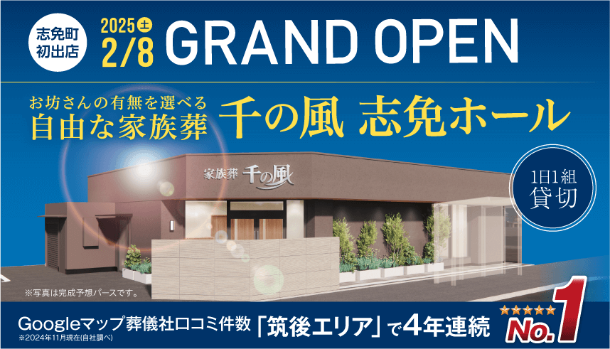 福岡県糟屋郡志免町という歴史と自然に恵まれた地域で、心のこもったご葬儀をサポートする「自由な家族葬 千の風 志免ホール」で、最愛の方との温かな別れのひとときをお過ごしください。