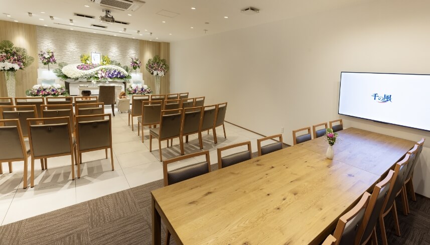 福岡県糟屋郡志免町にある「自由な家族葬 千の風 志免ホール」は、邸宅型の高級リビングが特徴の家族葬専用ホールです。最大30名までの家族葬に対応し、1日1組限定の完全貸切式場となっています。家族葬専用のデザイナーズ・リビングは、ご家族やご親族だけで自宅のようにリラックスしながら、故人との最後の時間を過ごせるよう設計されています。洋型祭壇をメインに据えたスタイリッシュで明るい内装が特徴で、宗教色を抑えた空間は無宗教の葬儀にも対応しています。