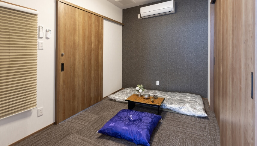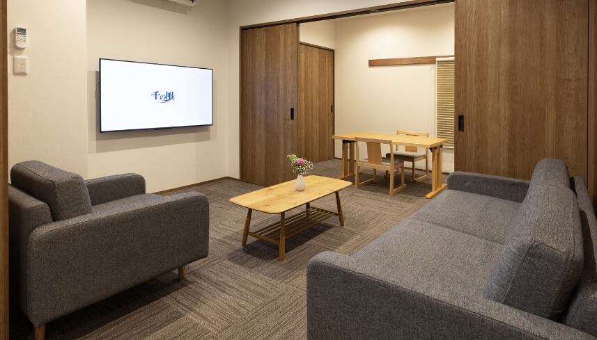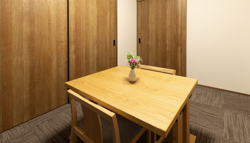 ホール内には、オープンリビングのほか、ご遺族控室と安置室を1部屋ずつ備えています。バスルームや各種アメニティーも完備しており、宿泊も可能です。ご家族が心ゆくまで故人と過ごせるよう、快適な環境を整えています。また、バリアフリー設計のため、ご高齢の方や身体の不自由な方も安心してご利用いただけます。