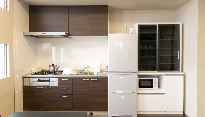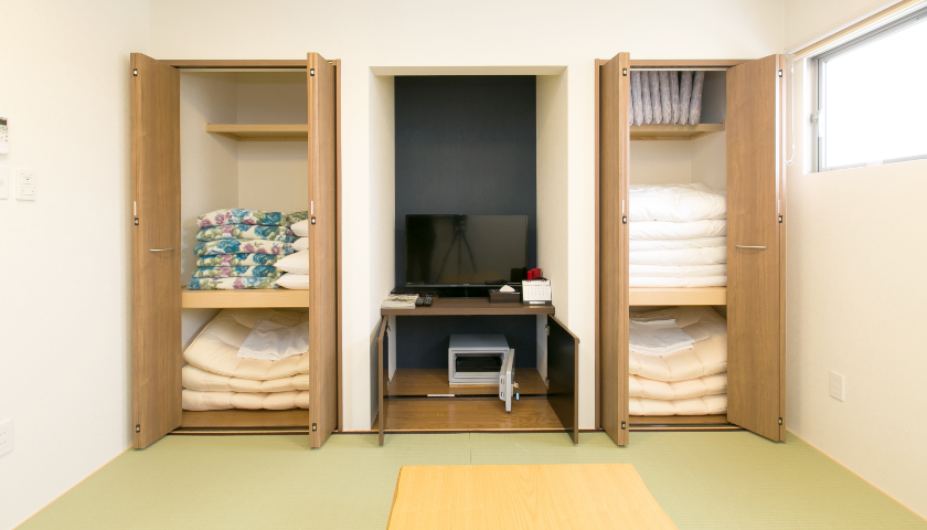 常備品 | テレビ、冷蔵庫、電子レンジ、電気ポット、寝具一式(常備2組・追加可能)、アメニティーセット |