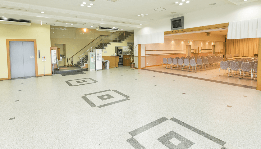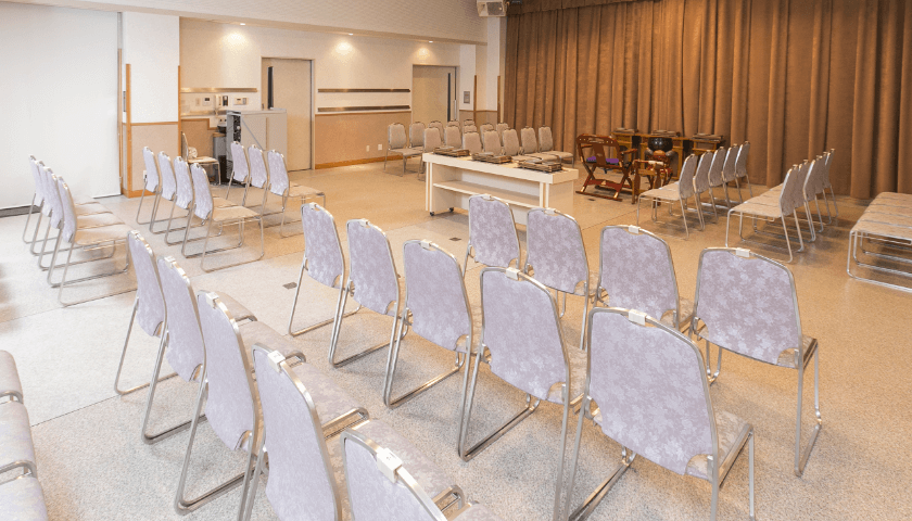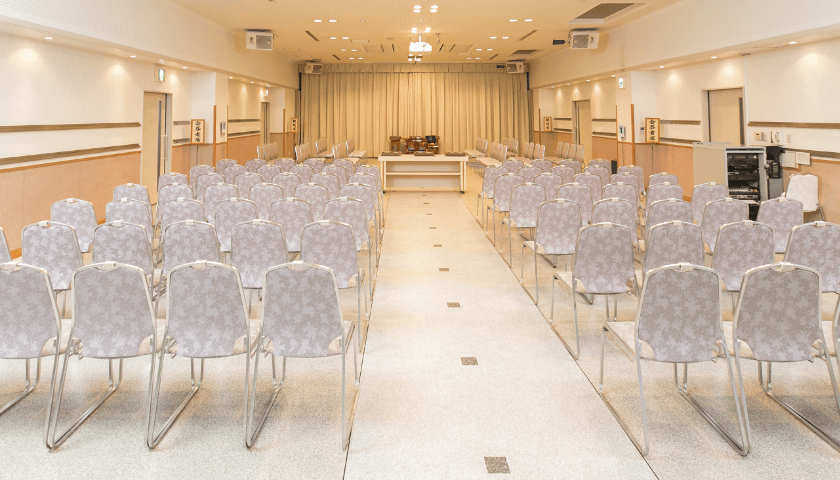 第一式場 | 収容席数:120席 正面には4間半(約8m)までの祭壇飾り可能 大規模ご葬儀の場合は、三つの式場(第一・第二・第三式場)を合わせて利用可能(会葬者600人程度) ※席数を減らすことにより少人数の家族葬式場としてご利用できます。 |
