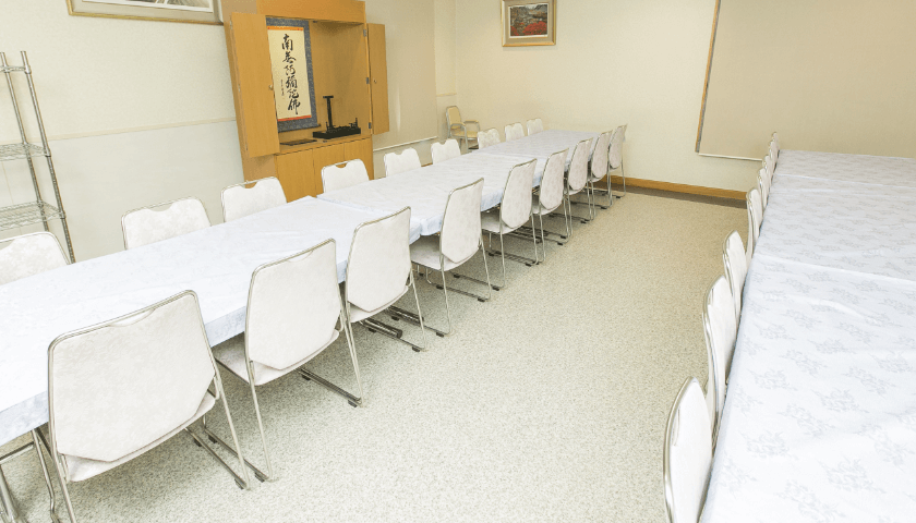 第二式場 | 収容席数:70席 正面には4間(約7m)までの祭壇飾り可能 ※席数を減らすことにより少人数の家族葬式場としてご利用できます。 |