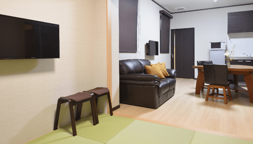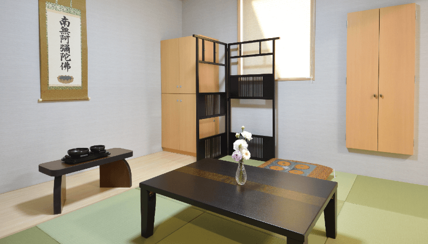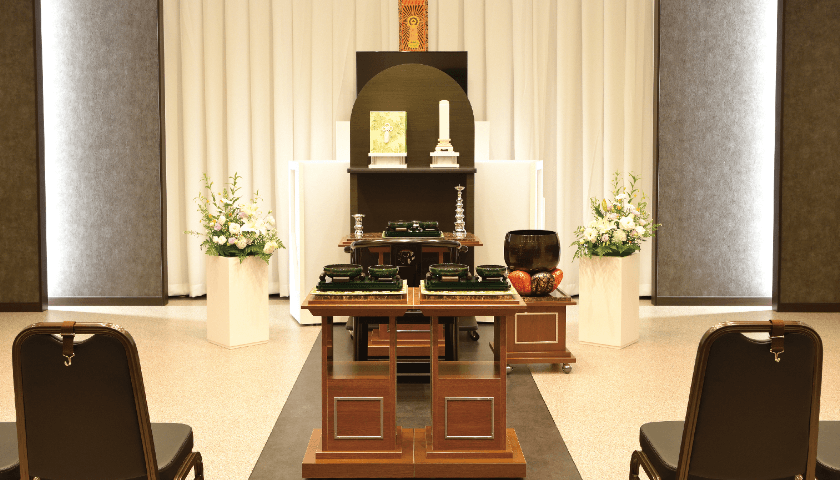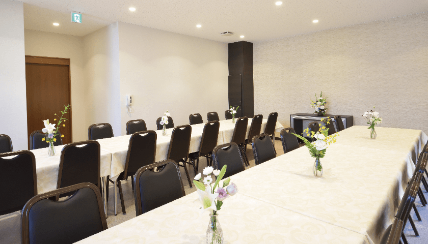 式場全景 | ・収容席数:30席 ・正面には(7m20cm)までの祭壇飾り可能 ・小人数の家族葬専用式場となっております ・親族控室、会食室、法要室、寺院控室 |