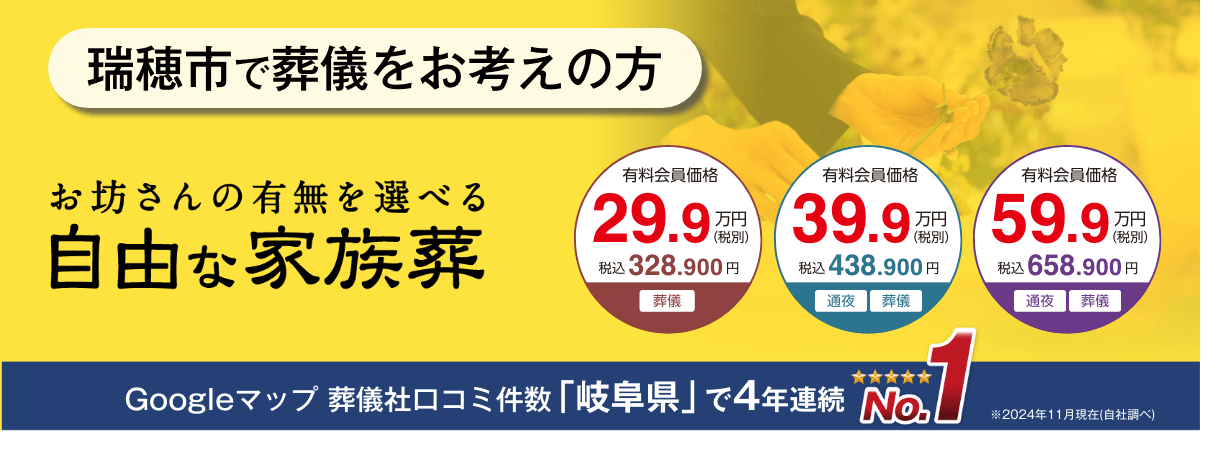 瑞穂市の葬儀に関する風習をご紹介します。瑞穂市の通夜・葬儀では一般的に参列者が多い傾向にあります。故人様・喪主様のお仕事の関係や、住んでおられる地域の方々、ご友人など広く参列されることが多いです。とはいえ、近隣の都市部の影響もあり、最近は日数をかけないように通夜を行わず、ご火葬の当日に葬儀・告別式のみを行う一日葬、お葬式を行わず火葬のみを行う火葬式も増えてきています。