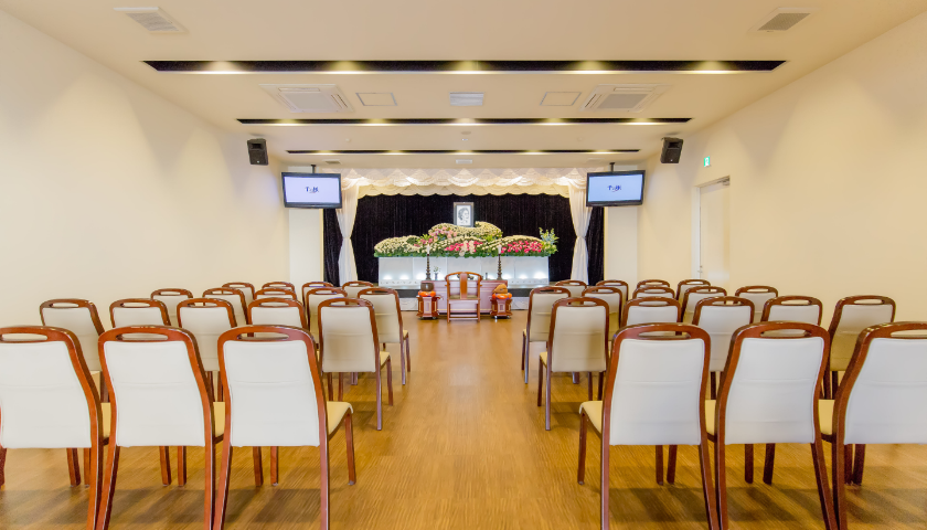 尼崎市にある「家族葬 千の風 尼崎南武庫之荘ホール」は、少人数の家族葬から150名の一般葬までさまざまな形式に対応している広々とした葬祭ホールです。天井の高い開放感あふれるエントランスから右手に向かうと葬儀会場がございます。葬儀会場の奥には広々とした空間にふさわしい荘厳な作りの祭壇があり、左右天井に大画面の「思い出モニター」が設置されています。大人数の会食・法要に対応できる大型のダイニングスペースもご用意。ご家族様・ご親族様は、専用の和室・洋室を控え室としてご利用いただけます。各種アメニティーや設備も充実しており、ご家族様・ご親族様だけでごゆっくりお過ごしいただけます。当ホールでは、お葬式相談サロンを併設しており、別の式が行われている日でも葬祭ホールの詳細やお見積りについてご相談が可能です。思い出いっぱいのお葬式ができるよう、きめ細やかな心配りと、ご家族様・ご親族様に寄り添う対応を心がけております。