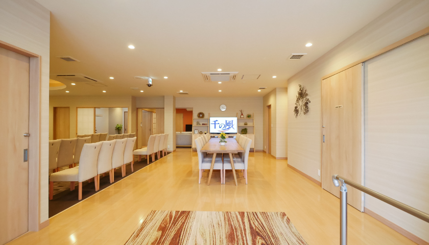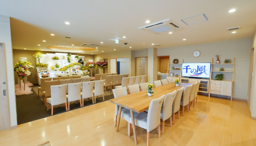 兵庫県川西市にある「家族葬 千の風 川西加茂ホール」は、少人数で想い出いっぱいのお葬式ができる家族葬専用ホールです。家族葬が中心ですが、一般葬など幅広い葬儀に対応できます。1日1組貸切のため、他のご喪家を気にすることなくご利用いただけます。リラックスした雰囲気で最後のお別れの時間をお過ごしいただけるよう、靴を脱いでご利用いただくスタイルとなっております。祭壇は40名程度の大人数で参列できる生花祭壇をご用意。そして式場の後ろにはメープル系のフローリングが広がる明るいリビングダイニングを設けました。ご家族で集い、故人様とのお別れの時間をごゆっくりお過ごしください。控え室として洋室1部屋と和室1部屋もご利用いただけます。清潔感のある洗面室やバスルーム、各種アメニティーも完備しており、ご宿泊も可能です。2019年オープンのため、設備が比較的新しいのも特徴です。バリアフリー対応ですべての部屋がワンフロアに収まっているため、高齢者や体の不自由な方もご安心ください。