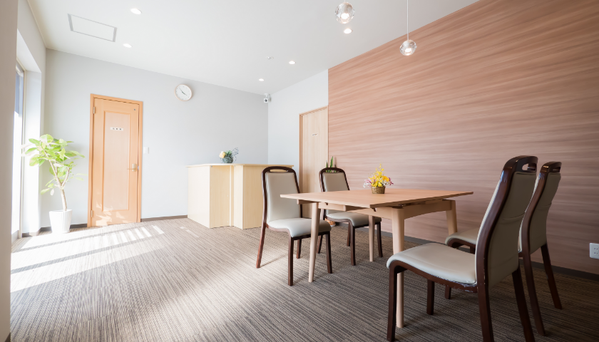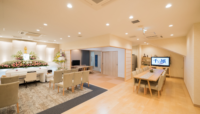 兵庫県西宮市の阪神甲子園球場すぐそばにある「家族葬 千の風 西宮甲子園ホール」は、少人数で想い出いっぱいのお葬式ができる家族葬専門ホールです。1日1組貸切のため、他のご喪家を気にすることなくご利用いただけます。少人数の家族葬はもちろん、50名程度までの一般葬や、最近増えつつある一日葬や無宗教葬にもご利用いただけます。カーペットの敷かれた厳かな葬儀式場を囲むように、居心地のよいリビング・ダイニング・キッチン、和室2部屋が設けられています。ご自宅のように自由にくつろぎながら故人様とお過ごしください。浴槽がついたお風呂や洗面所には各種アメニティーが完備されており、お泊まりいただく際も快適にご利用いただけます。ご家族・ご親族の絆を感じながら故人様をお見送りいただくのにふさわしい空間ですので、ぜひ一度ご見学にお越しください。ご見学会やご相談会は毎日開催しております。