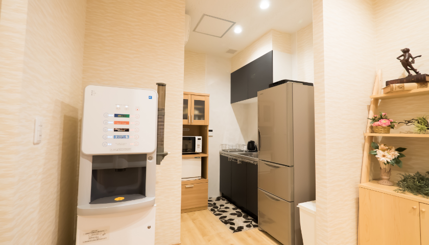常備品 | 歯磨きセット、シャンプー、リンス、髭剃り、綿棒、ボディタオル、ドライヤー、無料ドリンクサーバー、加湿器 |