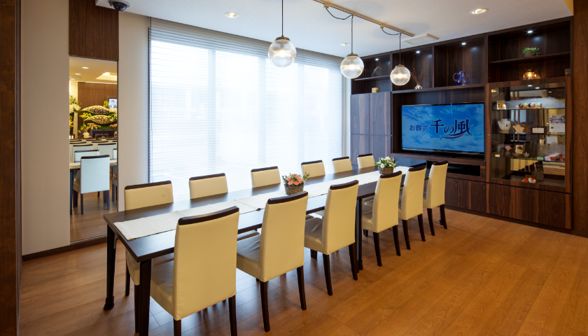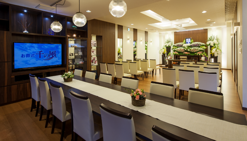 兵庫県西宮市の国道2号線沿いにある「家族葬 千の風 西宮瓦木ホール」は、まるでご家族が集まるご自宅のリビングのような家族葬専門ホールです。1日1組貸切のため、他のご喪家を気にすることなくご利用いただけます。家族葬はもちろん、50名程度までの一般葬や、最近増えつつある一日葬や無宗教葬にもご利用いただけます。エントランスホールからお入りいただくと、まず目にとまるのが印象的な木のオブジェ。葬儀を華やかに演出します。エントランスから向かって左手がリビングホール。シックでモダンな風合いの木目調で統一された雰囲気と、折り上げ天井から降り注ぐ柔らかな光が、生花で彩られる祭壇を引き立てます。ご会食や語らいの場となるダイニングスペースには、最大12名様までおかけいただける大きなテーブルを配置。オーダーメイドの壁面家具には大画面のテレビモニターを据えつけており、ホール内には故人様の想い出の品々をお飾りいただけるスペースもございます。葬儀式場には座席が24席ありますが、リビングの椅子を使用することにより36席まで増設可能です。
