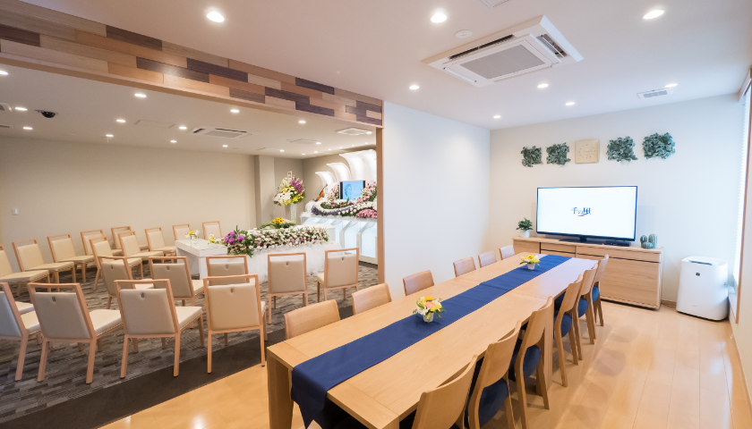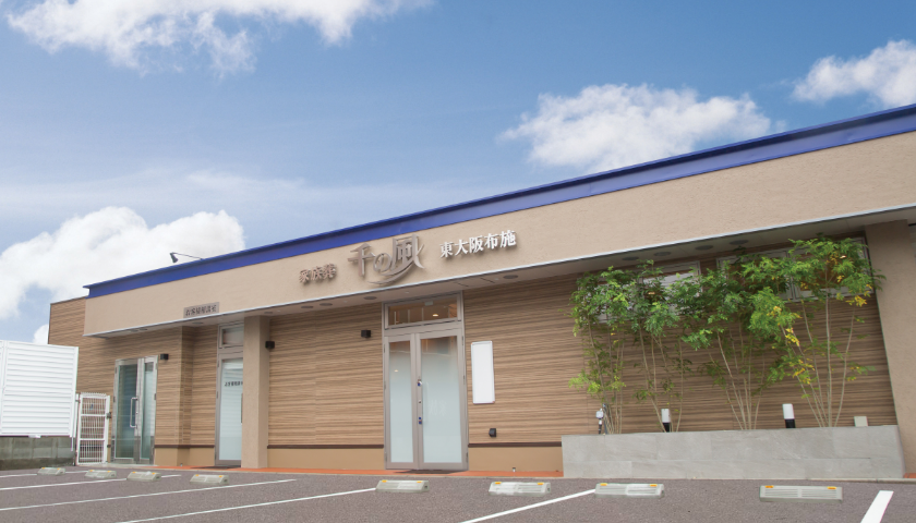 東大阪市の府道24号線沿いにある「家族葬 千の風 東大阪布施ホール」は、家族葬をはじめとする少人数葬儀のために専用設計された葬祭ホールです。1日1組様限定でご利用いただけるデザイナーズ空間となっており、他のご喪家を気にすることなくまるでご自宅にいらっしゃるようにゆっくりとお過ごしいただけます。専用ホールは少人数の家族葬から一般葬まで対応し、家族葬で35名、一般葬は50名程度まで収容可能です。故人様がお休みいただく祭壇を中心に、葬儀の人数や内容に合わせて座席をご用意いたします。そのほか、思い出の品をご鑑賞いただけるショーケースもご用意。長時間お過ごしいただけるよう、ゆったりとした洋室・和室のリビングスペースも完備。キッチンやバスルームなども最新設備となっており、ご宿泊の際など快適にご利用いただけます。バリアフリー設計となっておりますので、ご高齢の方や障害のある方も安心です。