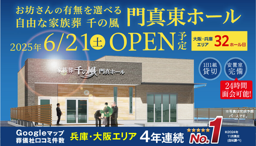 門真市にある、おすすめの葬儀場(自社式場)は6月21日(土)オープン予定の「自由な家族葬 千の風 門真東ホール」です。