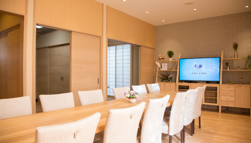 大阪府箕面市の国道171号線沿いにある「家族葬 千の風 箕面ホール」は、家族葬専用設計のデザイナーズホールです。1日1組の貸切で、他のご喪家を気にすることなくごゆっくりお過ごしいただけます。当ホールは玄関で靴を脱ぎ、クリーム色のフローリングの上で過ごしていただくスタイルです。玄関から入って右手が式場で、左手が清潔感あふれるリビングホールとなっています。「モデルルームみたい」「自宅でお葬式しているみたいな雰囲気ね」といったお声を頂戴しております。館内はバリアフリー設計となっておりますので、ご高齢の方や障害のある方もご安心ください。控え室としてご利用いただける和室2部屋には貸布団が4組標準でセットされているため、ご宿泊も可能です。サニタリーやバスルームには最新設備が整っております。当ホールは大切な方との最後のお別れの儀式を、誠心誠意お手伝いさせていただきます。