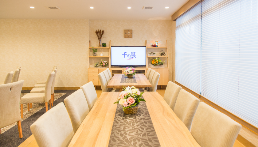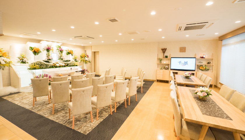大阪府豊中市、豊中南郵便局のはす向かいにある「家族葬 千の風 豊中服部ホール」は、まるでご家族が集まるご自宅のリビングのような家族葬ホールです。豊中市内の千の風2号店としてオープンいたしました。現代のお葬式スタイルに合わせて、ご家族が集い、想い出いっぱいのお葬式ができる施設となっています。家族葬だけでなく、最大50名までの一般葬にも対応可能です。当ホール内はリラックスできるよう靴を脱いでご利用いただくスタイルです。内装は淡いベージュを基調としており、温かい雰囲気の中で葬儀・告別式を執り行えます。設備は宗教色を抑えた配慮がされているため、無宗教葬も可能です。大人数でご歓談いただけるリビング・ダイニングのほか、控え室として和室2部屋とキッチン、バスルームもご用意いたしました。各種アメニティーも完備しておりますので、ご宿泊も可能です。故人様との最後の時間を心ゆくまでごゆっくりお過ごしください。