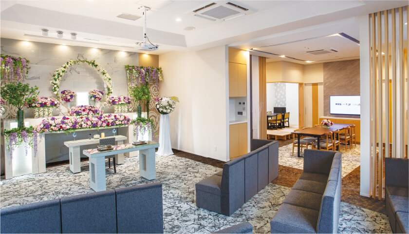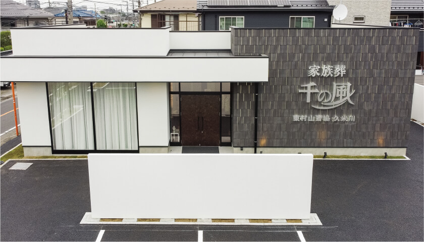 東村山市久米川町の府中街道沿いにある「家族葬 千の風 東村山斎場 久米川」は、邸宅型の高級リビングが特徴の葬儀斎場です。家族葬30名まで対応で、1日1組完全貸切の式場となっています。当斎場の特徴である家族葬専用デザイナーズ・リビングは、ご家族・ご親族だけで自宅のようにリラックスしながら最後のお別れの時を過ごせるよう設計されています。洋型祭壇をメインに据えたスタイリッシュな内装でとても明るいイメージの空間です。宗教色が抑えられているため、無宗教葬儀にも対応しております。ホールとオープンリビングのほか、ご遺族控室を1部屋、安置室を2部屋備えております。バスルームや各種アメニティーも完備しているため宿泊も可能です。故人様との最後の時間を心ゆくまでごゆっくりお過ごしください。また、バリアフリー対応のため、ご高齢の方や身体の不自由な方も安心です。西武鉄道の東村山駅からもタクシーで5分程度と利便性も高く、近くにはスーパーやレストラン、コンビニエンスストアーなどもございますので、お食事や急な買い出しなどに利用可能です。