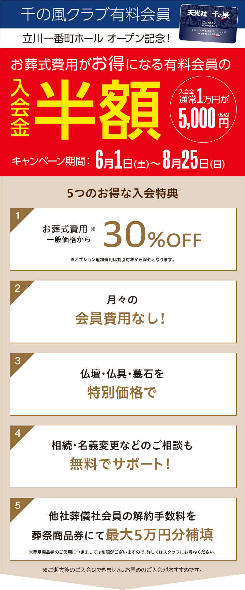 天光社は、1955年福岡県柳川市に創業し、信頼と実績を積み重ね、2009年より中部、関西、関東へ出店を続け、今回53ホール目、東京都に6斎場目の「自由な家族葬 千の風 立川一番町ホール」を新規オープンいたします。地域の皆様の終焉のお役に立てるよう邁進してまいります。