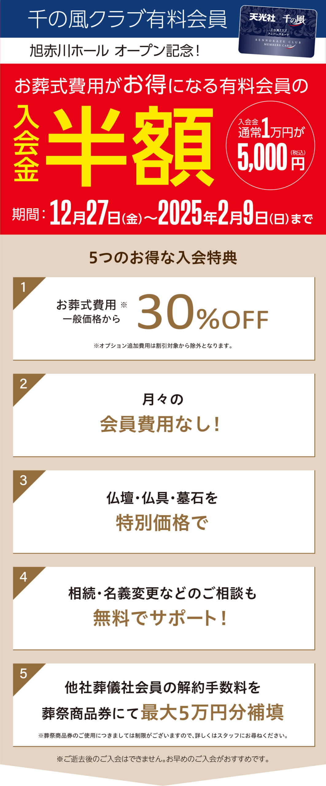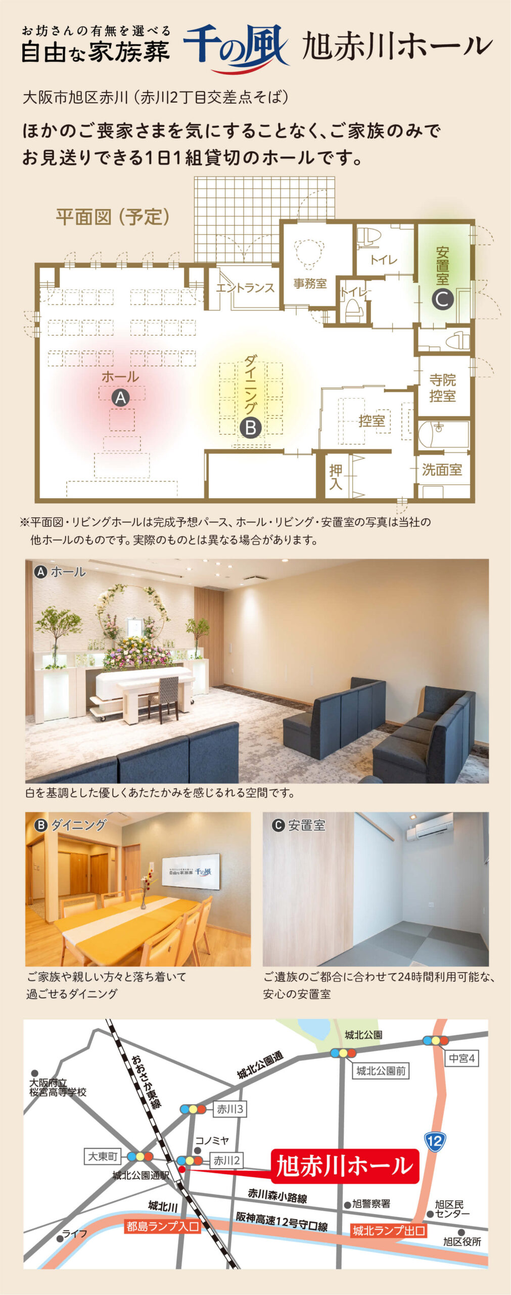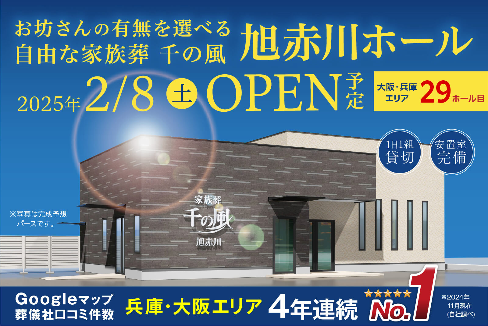 天光社は、1955年福岡県柳川市に創業し、信頼と実績を積み重ね、2009年より中部、関西、関東へ出店を続け、今回59ホール目、大阪・兵庫エリアでは29ホール目となる「自由な家族葬 千の風 旭赤川ホール」を新規オープンいたします。地域の皆様に選ばれる葬儀社を目指しています。