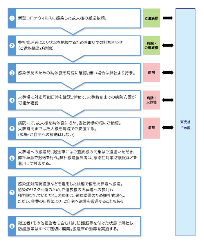 新型コロナウィルスに感染された故人様のご葬儀等に関する手順等は、下記の通りとなります。