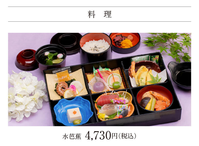 千の風では、地元の料亭と提携し、法事専用のオリジナル料理をご用意いたしました。『水芭蕉』4,730円(税込)。上質な食材を使用し、ご参加の皆様にご満足いただけるお料理を心を込めてご提供いたします。また、アルコールを含むお飲み物につきましては、お持ち込みでの対応となりますので、必要に応じてご用意ください。